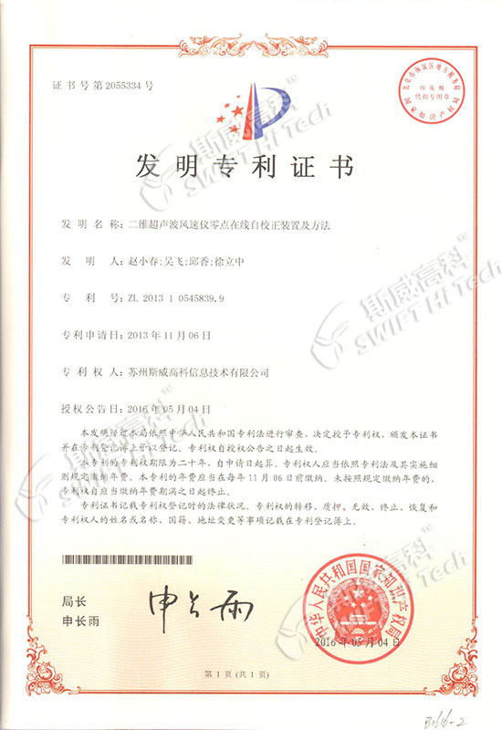 發(fā)明專利證書:二維超聲波風(fēng)速儀零點在線自校正裝置及方法