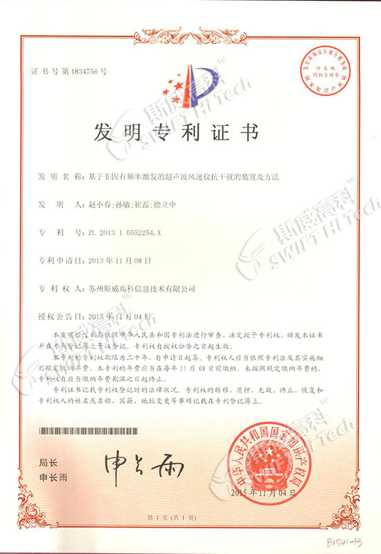 發(fā)明專利證書:基于非固有頻率激發(fā)的超聲波風(fēng)速儀抗干擾的裝置及方法