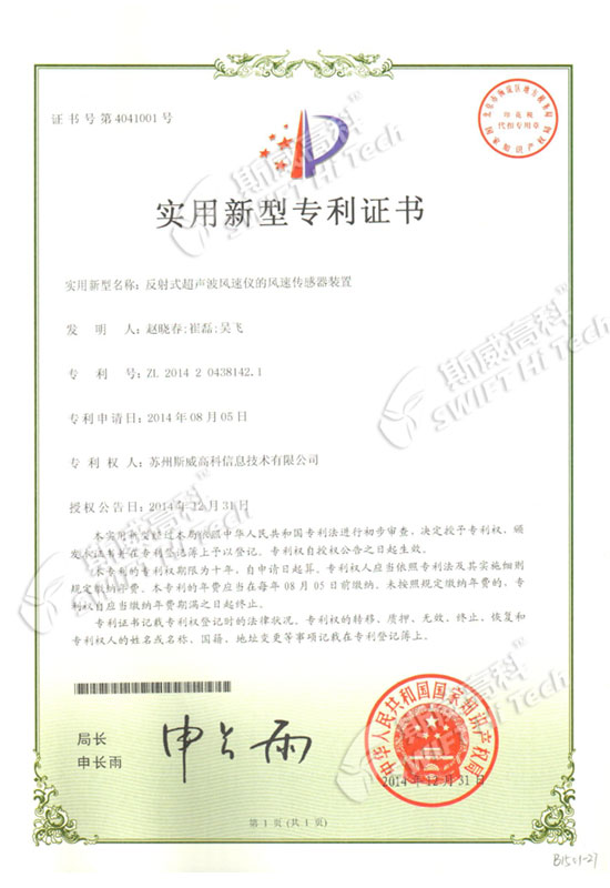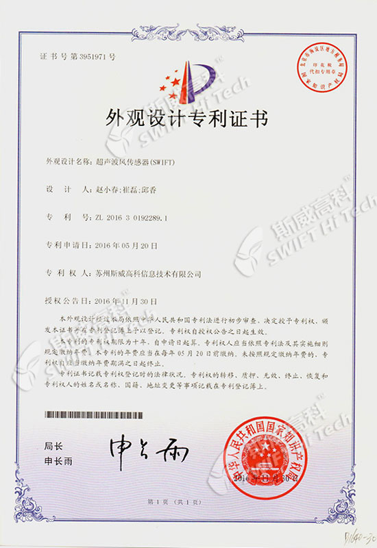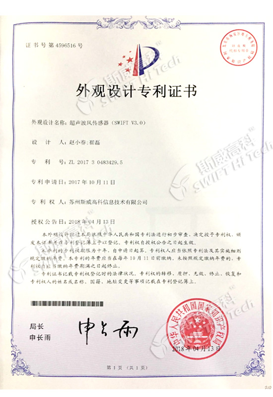 外觀設(shè)計專利證書:超聲波風(fēng)傳感器(SWIFT V3.0)