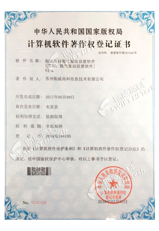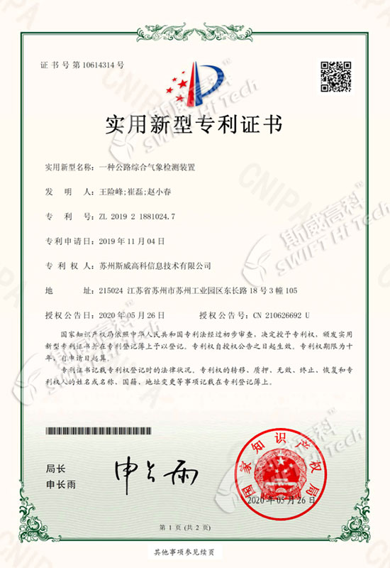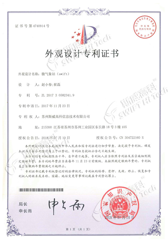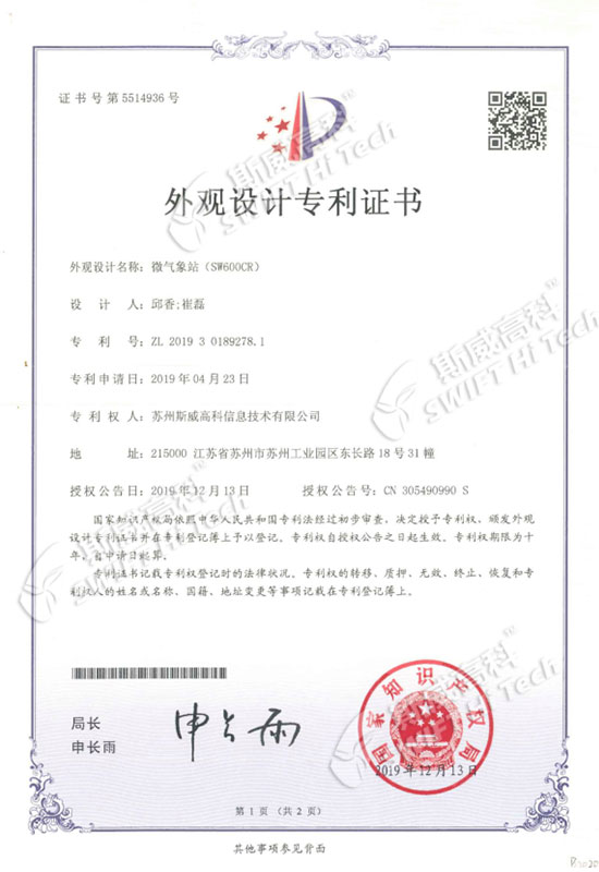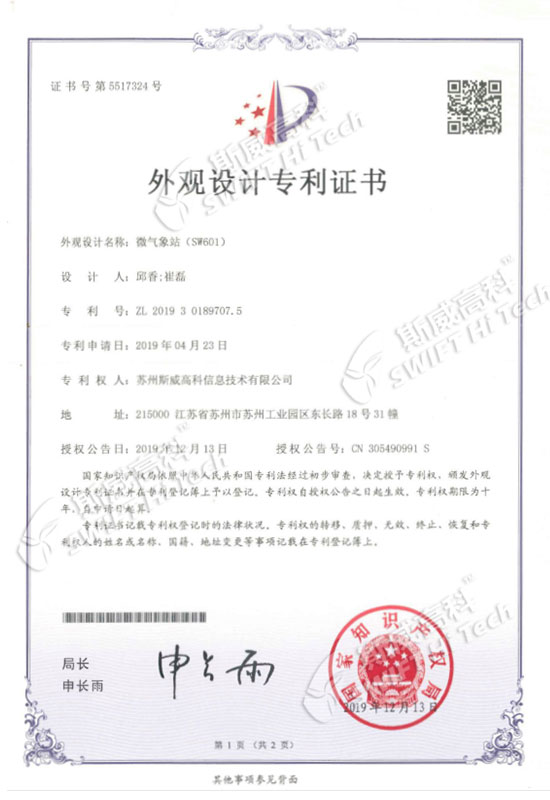 蘇州斯威高科信息技術(shù)有限公司 外觀設(shè)計專利證書:微氣象站SW601