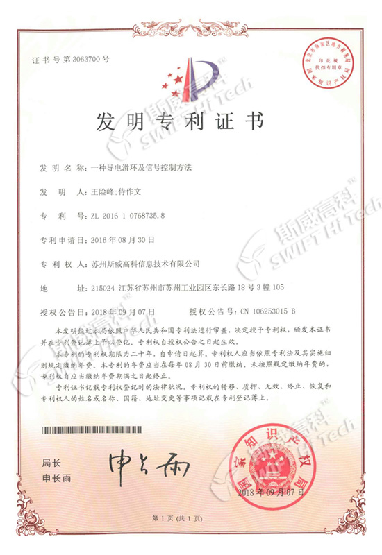 發(fā)明專利證書:一種導(dǎo)電滑環(huán)及信號控制方法