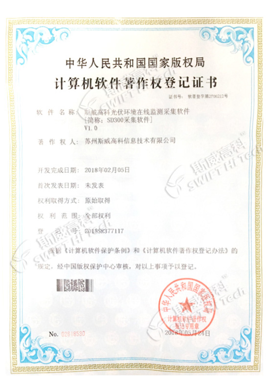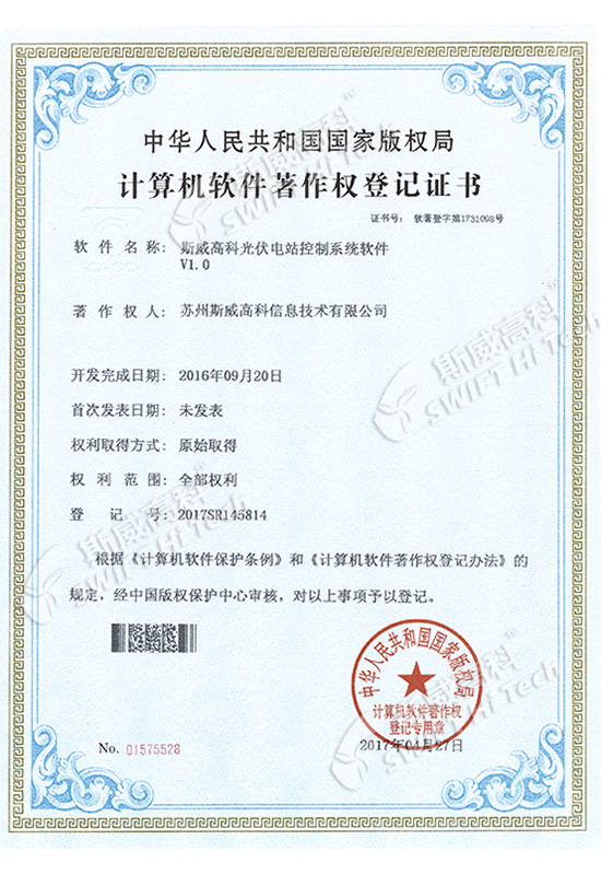 斯威高科光伏電站控制系統(tǒng)軟件V1.0 登記證書