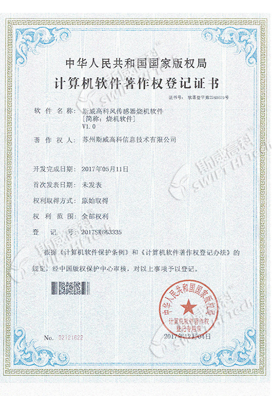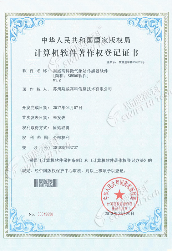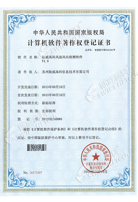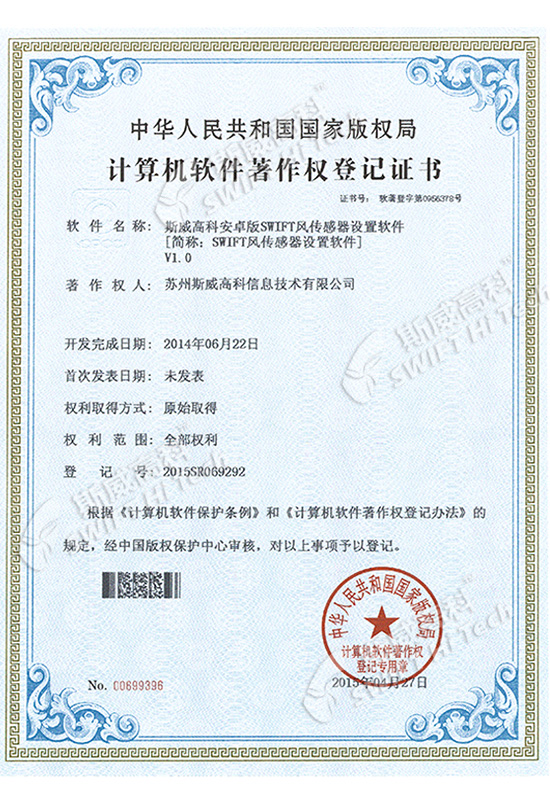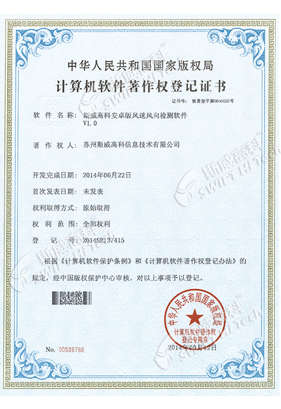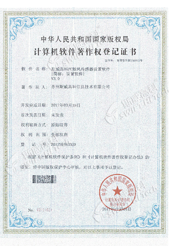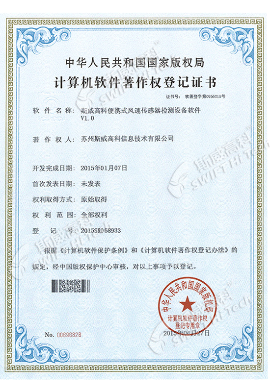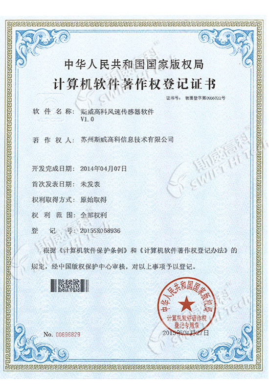 斯威高科風(fēng)速傳感器軟件V1.0 登記證書