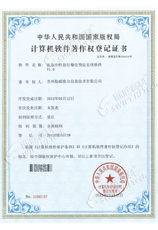 凱斯比特藍釘餐位預(yù)定系統(tǒng)軟件V1.0 登記證書