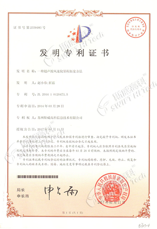發(fā)明專利證書:一種超聲波風(fēng)速儀量程擴寬方法