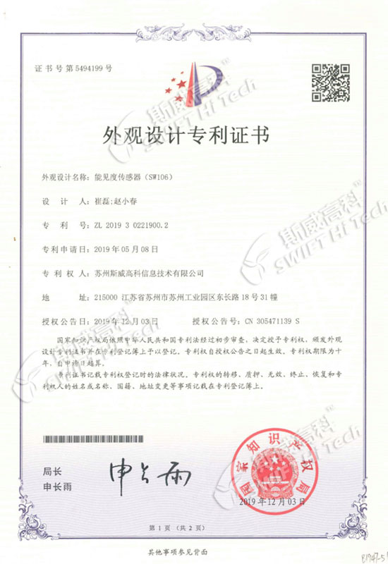 外觀設(shè)計專利證書:能見度傳感器SW106