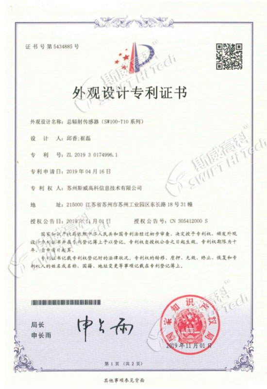 外觀設(shè)計專利證書:總輻射傳感器 SW100-T10系列