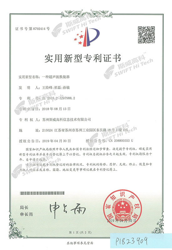 實用新型專利證書:一種超聲波換能器