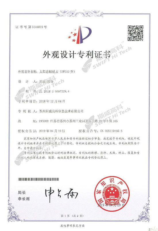 外觀設(shè)計專利證書:太陽總輻射表(SW100)